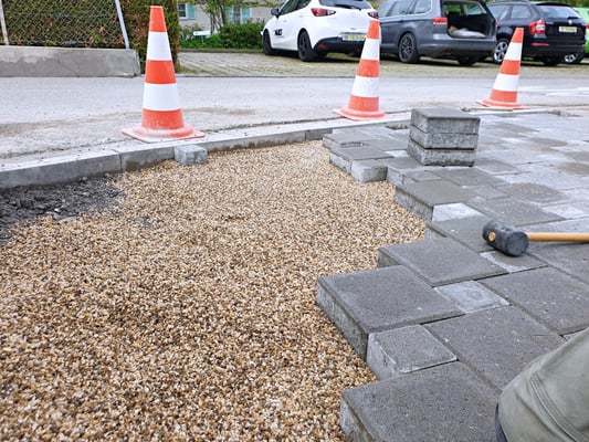 Setzen von Stellriemen zur Strassenbegrenzung und Verlegen von Sickersteinplatten für eine funktionale Entwässerung.